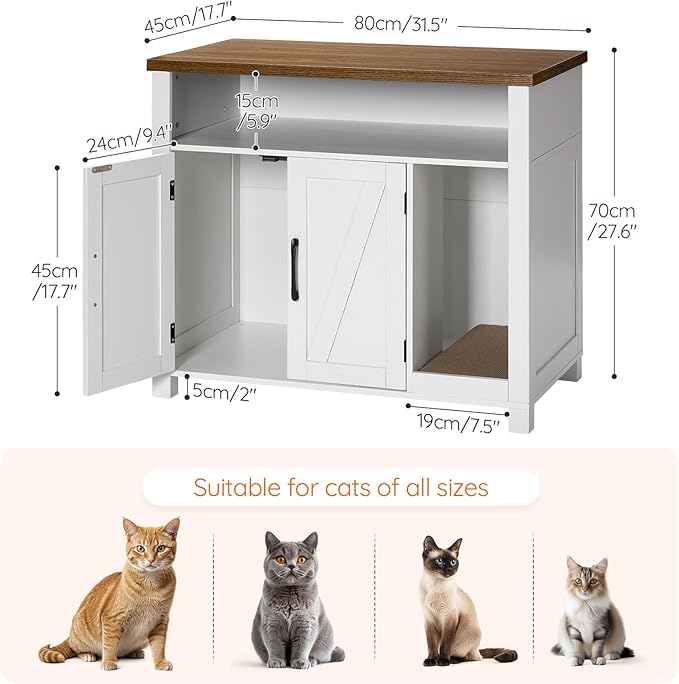 - Multifunctional Use: Measuring 31.5"L x 17.7"W x 27.6"H, the cat litter box furniture cabinet can hold a litter box or a cat pad for a cozy nest. The top double-layer shelf gathers cat supplies and can also display home decorations