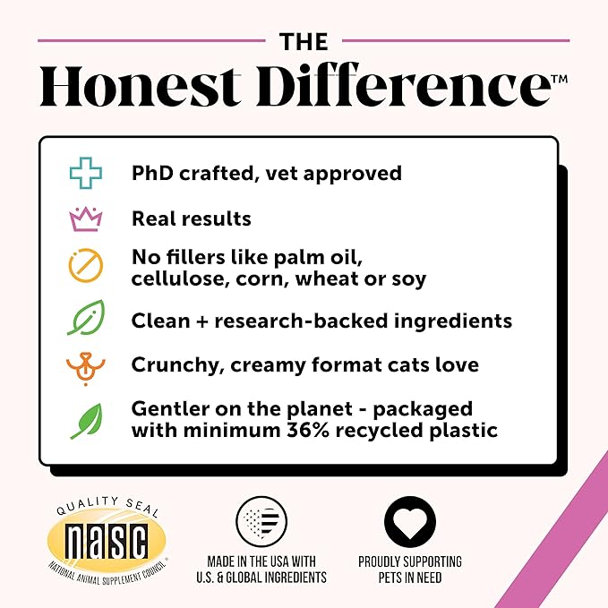 - A Texture and Taste Cats Love: Pet Honesty’s Multivitamin for cats is a delicious supplement that contains essential vitamins, minerals, and nutrients to support your cat’s overall health. Powerful, wholesome ingredients are packed inside a unique texture format: crunchy on the outside and creamy on the inside, offering a taste and texture combination that cats love.