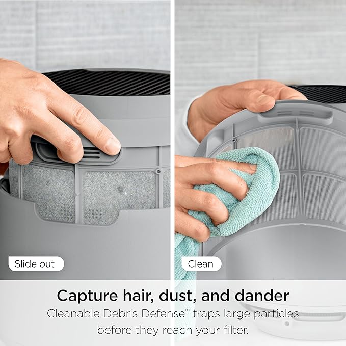 - Debris Defense Protection: Pulls in large particles like hair, dust, and dander, preventing buildup on your HEPA filter and maximizing performance. Easily remove the screens and vacuum, wipe, or rinse them clean in seconds.