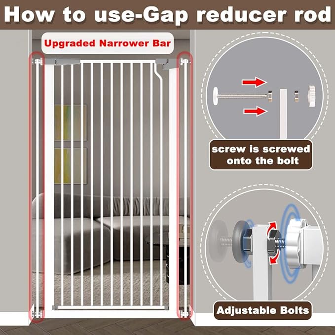 - 【Adjustable Width Design】 This metal tall pet gate features an adjustable width ranging from 29.5" to 40.5", making it suitable for various spaces, including wide living room openings, doorways, narrow hallways, and stairs. The tall dog gate indoor comes with two added reinforced rods, which enhance its stability and strength, making it ideal for both childproofing and pet-proofing your home.