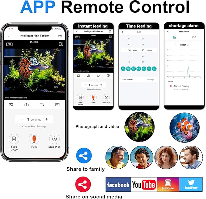 - 24/7 Monitoring with HD/SD Camera: Equipped with an HD/SD camera and night vision, this automatic fish feeder allows continuous tank monitoring. The camera uses nano adhesive, enabling it to be repositioned up to 30 times for adjusting angles to view your fish perfectly. Monitor your tank in real-time through the app, capture photos, record videos, and share on social media, making it ideal for vacation feeding or daily care.