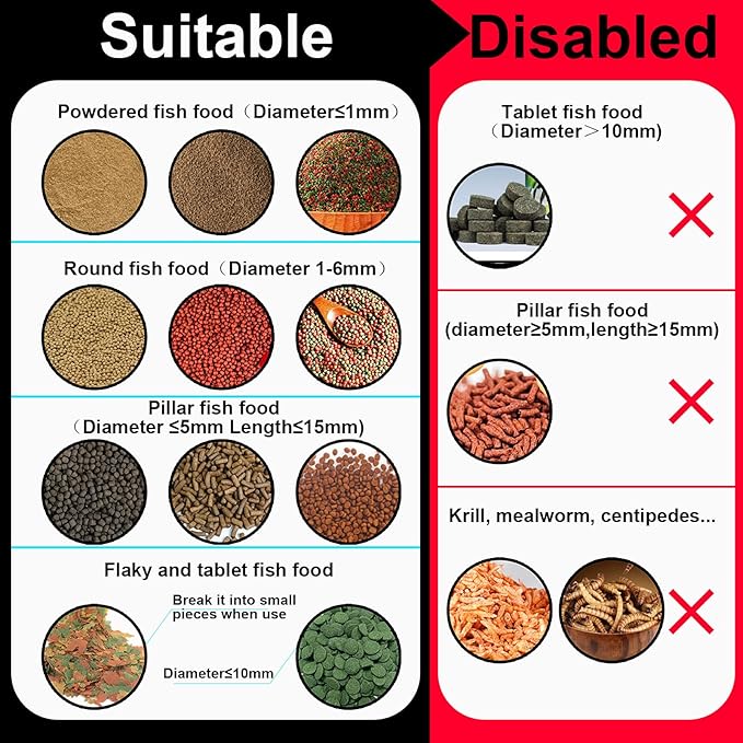 - Precision Feeding with Customizable Portions: Designed for Betta, Goldfish, Clownfish, and more, this fish feeder allows precise portion control in 0.2g or 0.6g each feed increments to prevent overfeeding. It supports scheduling multiple small feeds throughout the day to ensure proper nutrition, minimize food waste, and effectively reduce water pollution. Suitable for both freshwater and saltwater tanks, it’s not recommended for shrimp or flakes.