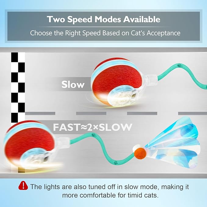 - 【Adaptive Play Settings】Choose between two optimized modes: Gentle Mode (amber light): Activated via 2-second button press, delivers subtle motion without lights - perfect for senior cats or anxious pets Active Mode (cyan light): Instant button tap initiates vigorous movement with realistic bird chirps, ideal for energetic felines on any surface