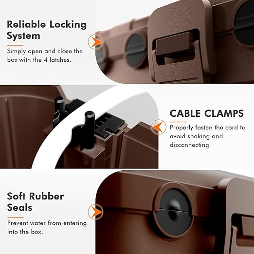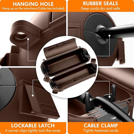 - HEAVY DUTY & WEATHERPROOF: Constructed with industrial grade material, highly durable and UV resistant, great to use in outdoor harsh environment and resist water, snow, rain, dust, dirt. Ideal to protect outdoor extension cord, LED string light, landscape lighting, pool pump, garden power tool, fountain, Christmas and other holiday decorations.