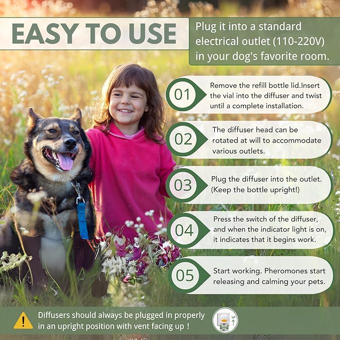 - 【Safe, Non-Toxic & Odorless】 Formulated with non-toxic, inedible ingredients, this dog diffuser is safe to use around all breeds. It’s scentless, mess-free, and a perfect choice for pet parents seeking an easy calming solution without side effects