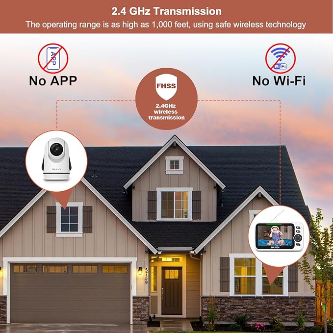 - Secure Easy Setup, No Wifi No App:This Baby Monitor Offers a Simple, Secure Setup With No Wifi or Apps Needed. Utilizing Advanced 2.4GHz FHSS Technology and Digital Encryption, It Guarantees a Stable, Hack-Free Connection between the Camera and Monitor. Enjoy Instant Peace of Mind with Effortless, Private Monitoring, No Complicated Setup Needed.