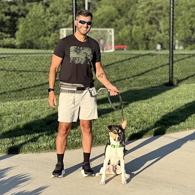 - 【DUAL PADDED HANDLES FOR ENHANCED CONTROL】 Equipped with two soft neoprene-padded handles, the TAILS & TALES waist leash for large dog ensures a comfortable grip for better control. The handle near your waist allows for effortless redirection, keeping your dog on track without disrupting your stride. For added safety in crowded areas or near traffic, the lower handle near the collar offers direct and immediate control, keeping your dog close and secure.