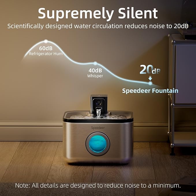 - [20dB Supremely Silent]: Whisper-quiet operation ensures the cat drinking fountain won’t disturb you or startle your cat. The advanced pump runs below 20dB, so even at night you’ll barely hear a sound. Your cat can drink comfortably without stress or anxiety from noise, and you can enjoy a peaceful home environment.