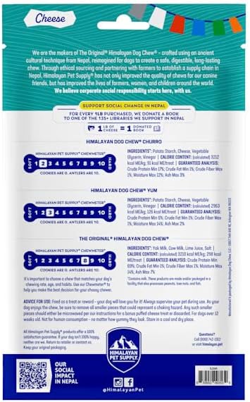 - Say Cheese! Variety Pack for Every Chewer Includes 1 Original Himalayan Dog Chew, 2 YUM Cheese, and 2 CHURRO Cheese. These dog chew treats come in multiple chew densities, making them perfect cheese sticks for dogs who love to chew while supporting dental health.