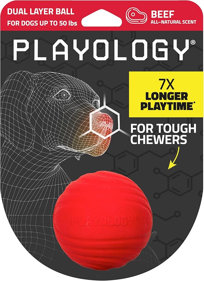 - Playology's Dual Layer Chew Ball: This extra durable dog toy is the medium dual layer dog ball featuring a special 2-layer design to withstand aggressive chewers and keep them entertained. This heavy duty rubber dog ball is ideal for medium breeds (up to 50 lbs). Durable enough to withstand play indoors and outdoors, this medium dog ball is an essential item to entertain your K9 companion.