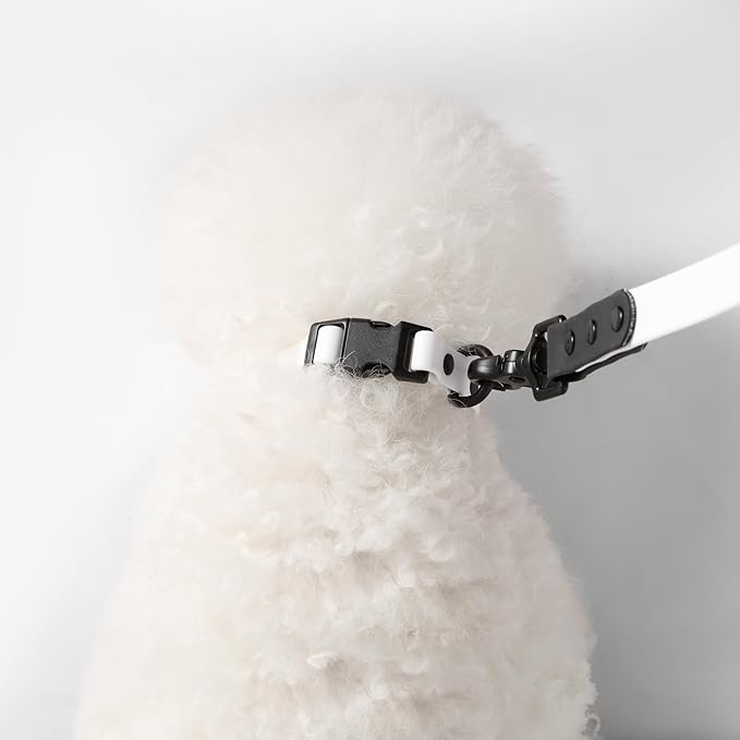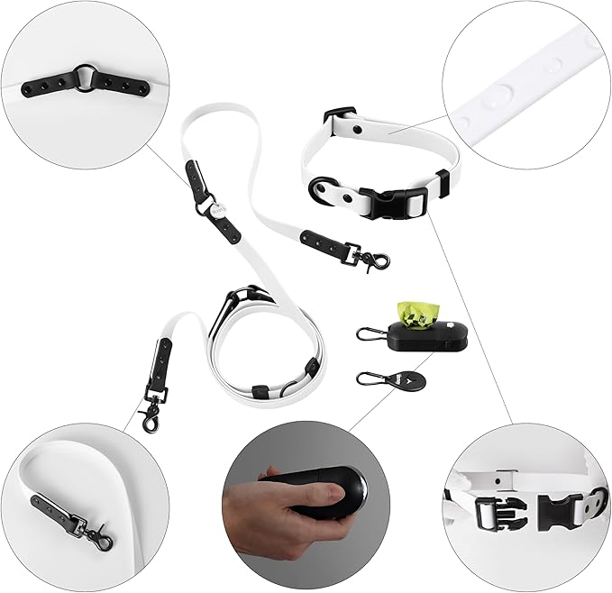 - Collar and leash are a two-toned white and black design; bag dispenser and waste holder are black