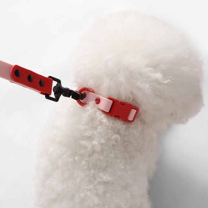 - Collar and leash are a two-toned pink and red design; bag dispenser and waste holder are almond