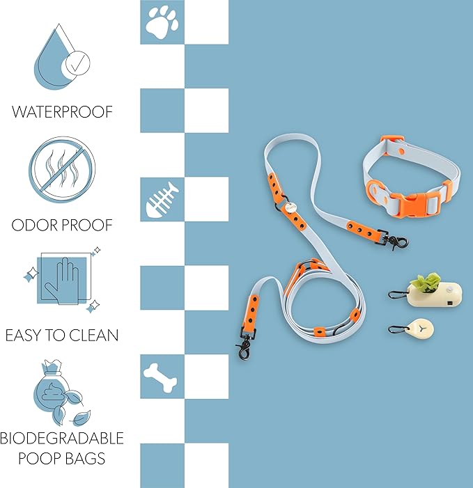- Collar and leash are a two-toned light blue and orange design; bag dispenser and waste holder are almond