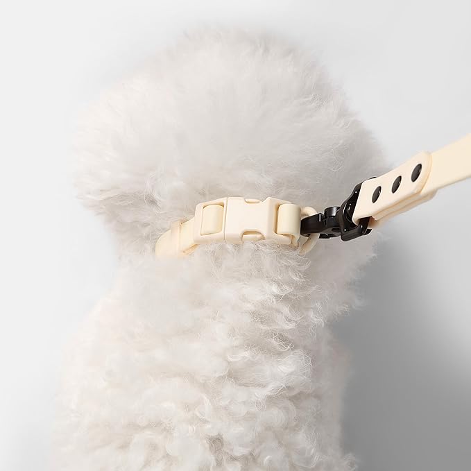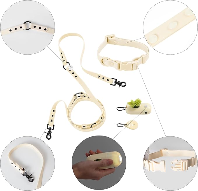 - Collar and leash are a mono-toned almond design; bag dispenser and waste holder are also in almond