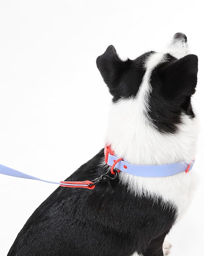 - Collar and leash are a two-toned periwinkle and red design; bag dispenser and waste holder are almond