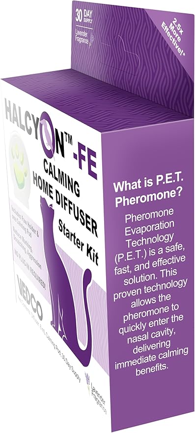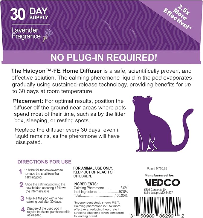 - When smelled by cats, Halcyon helps address the following: Separation Anxiety, Sound Anxiety (loud noises), Travel Stress. Lasts for 30 days.