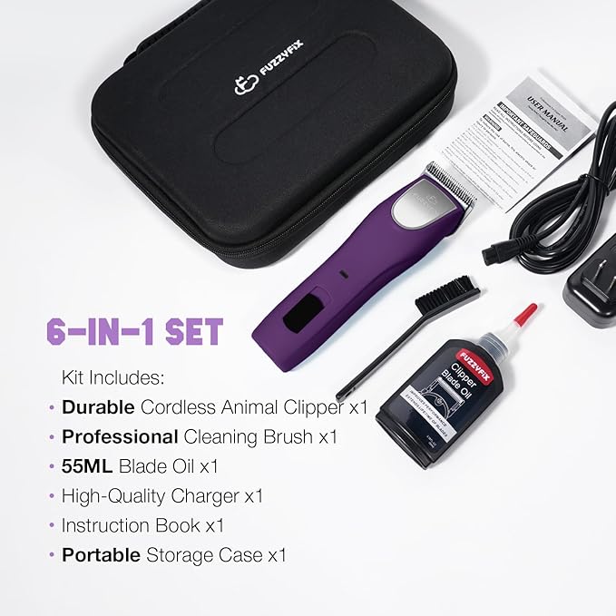 - 【What You Get】FuzzyFix 6-IN-1 Grooming Set Includes everything you need, perfect for professional groomers! Package contains with Durable Cordless Animal Clipper *1, Professional Cleaning Brush *1, 55ML Blade Oil *1, High-Quality Charger *1, Instruction Book *1, Portable Storage Case *1.