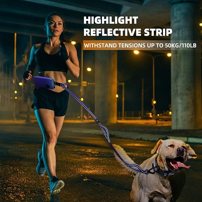 - 【Dual Handles Better Control】New ADDED SECOND HANDLE, lower handle for quick-response training, busy streets, traffic safety, or sudden stops. Upper handle for relaxed walks and used as a regular puppy leash. 360° swivel clip prevents tangles allows your dog to get enough freedom. Reflective stitch across entire handsfree leash to provide greater nighttime visibility, make sure to walk or run safely with your dog at night!