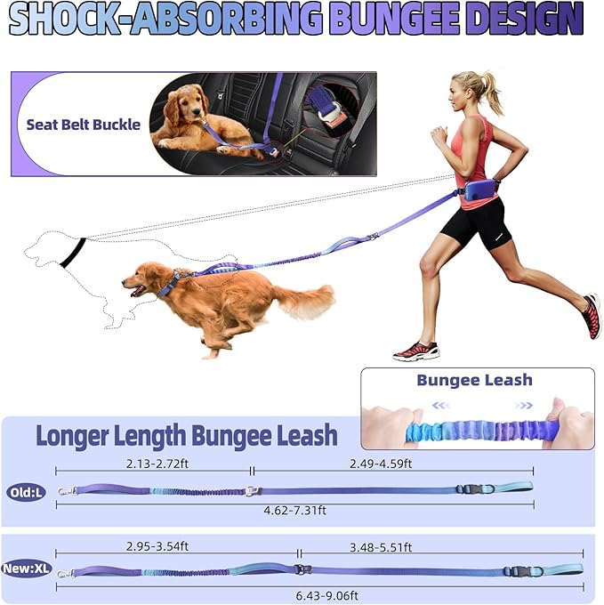 - 【Longer & Safer Freedom】UPGRADED 6-9FT HANDS FREE DOG LEASH with 1" Width, adjustable 15.7" -66.1" Waist Range and 6.43-9.06 FT totally length range gives energetic dogs 50% more roaming space than old 4-6ft leashes. Running leash hands free perfect for park adventures, hiking trails, or training sessions while keeping full control. Anti-shock bungee cord reduces sudden pulls.