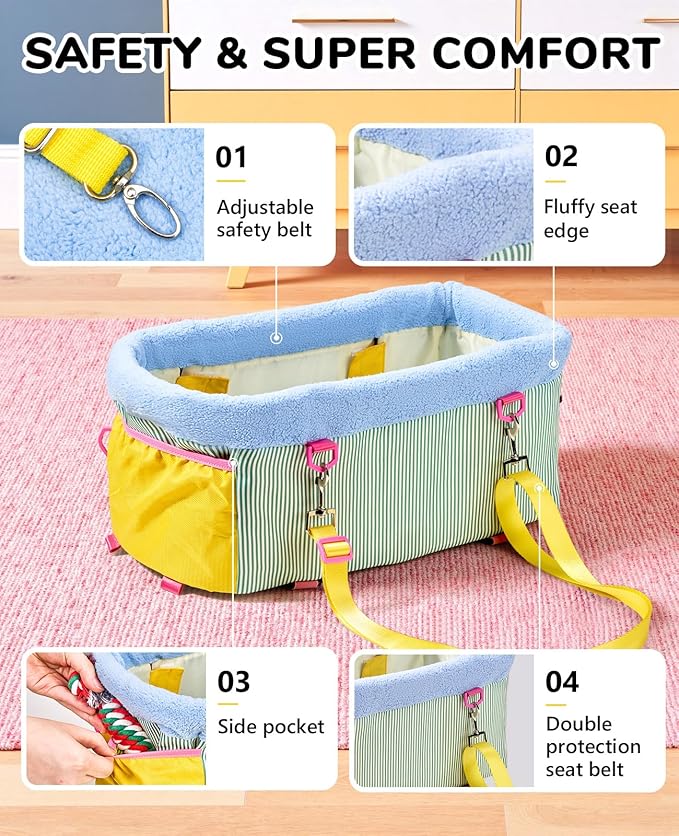 - Dual Protection Safety Design: Our puppy car seat features double protection safety belts on both sides, providing the best emergency brake protection for your furry friend. Two adjustable bottom straps ensure a better fit for different car models.