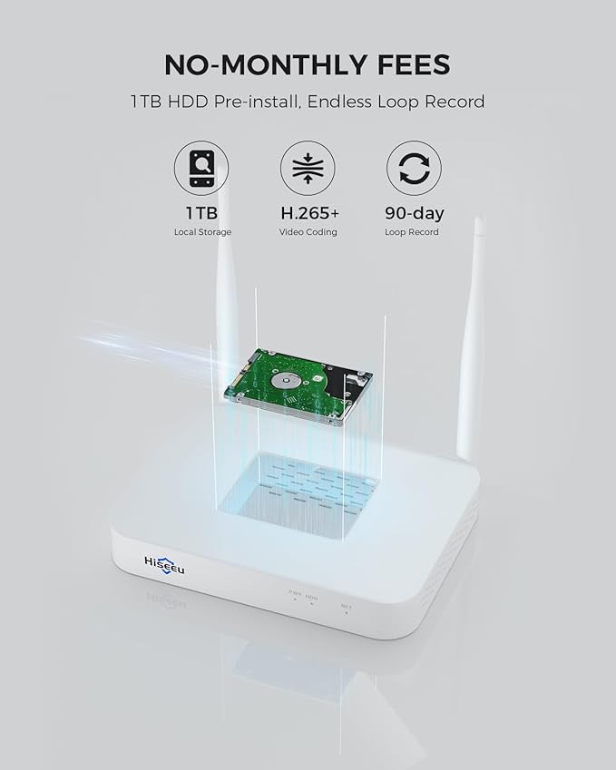 - No Monthly Fees with 1TB HDD: All footage will be encrypted by the base box, which is equipped with a 1TB hard drive, ensuring there are no hidden fees. H.265 transfer, live streaming, and storage will be stable and fast, with no delays. The original system can record up to 90 days of continuous loop storage