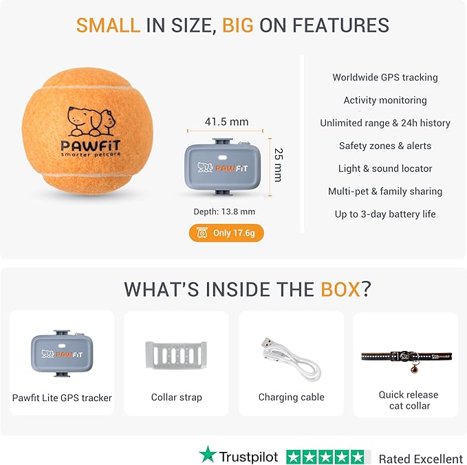 - Designed for your cat: Weighing less than 18g, this waterproof tracker is ultra lightweight and small and comes with a Pawfit cat safety collar.