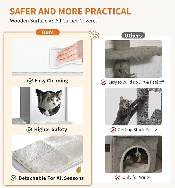- Easy to Clean, Comfortable to Use—The removable soft cushions are covered in dense plush for cozy naps and can be machine-washed for easy maintenance. The wood surfaces are smooth and stain-resistant, allowing quick cleanups and a fresher environment for both you and your cats.