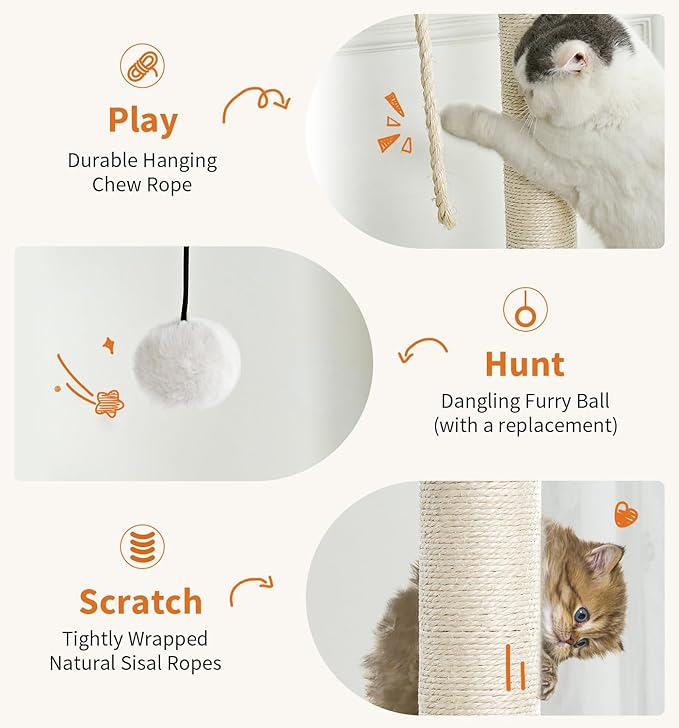 - Superior Stability & Durability—Built with a reinforced wood structure, extra-thick baseboard, and sisal-wrapped posts, this cat tower with scratching post ensures long-lasting strength and balance. An included wall anchor kit adds an extra layer of safety for energetic jumpers and climbers.
