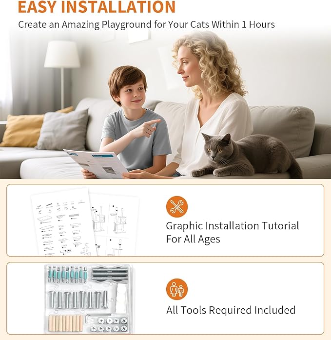 - Easy Assembly, Big Fun—This thoughtfully designed cat tree tower includes clear step-by-step instructions and all required tools, making the setup process simple and stress-free. Once assembled, it becomes a reliable source of daily comfort, fun, and enrichment for your feline companions.