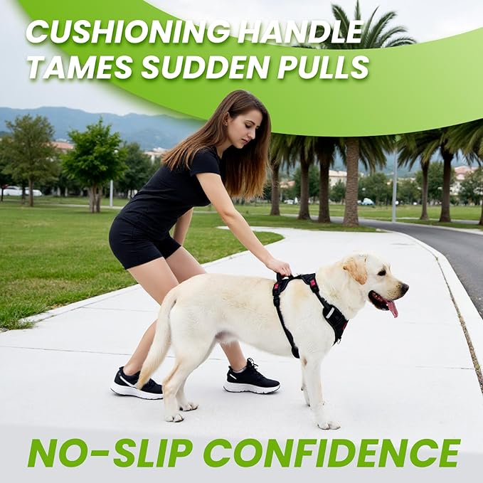 - CUSHIONED ANTI-PULL HANDLE—When your 80 pound fur rocket spots a squirrel, our no-pull harness's flat palm design will grip like your hiking gear. The neoprene cushioning (yes, the same stuff in wetsuits!) absorbs tugs like a car's seatbelt - no more rope burns or numb fingers after walks. Unlike thin straps, our widened base spreads pressure across your palm - say goodbye to red marks after walks.