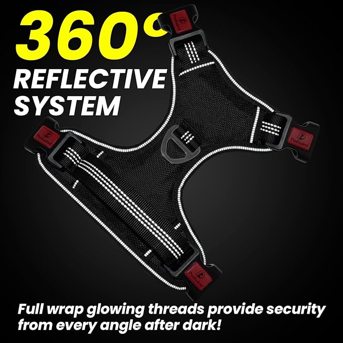 - NIGHT VISIBILITY—When dusk walks turn into safety worries, our full-wrap reflective threads light up brighter than standard strip. Unlike basic harnesses only reflect head-on light, our woven-in threads on chest strap, side connectors, and back panels glow from every angle! Let our Night Reflective harness be the guardian of your dogs' safety! evening walks should thrill your pups, not chill your spine.