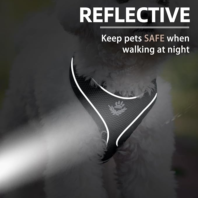 - QUALITY MATERIALS: Made of premium polyester materials, it's adopted with an air-mesh design, so it's very lightweight and breathable. The soft edge keeps the dog always comfortable, it's no pull and no choke. And sturdy webbings make sure the harness can be used for a long period. The metal D-ring will connect to the matching leash to keep the control by you