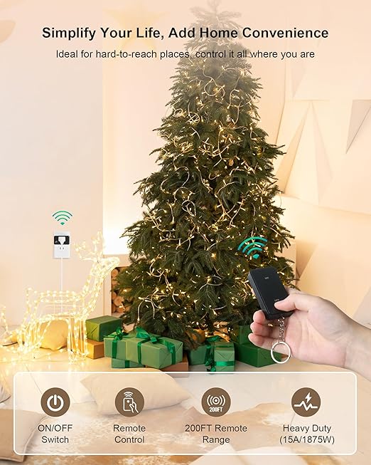 Remote Control Outlet Plug, 200FT Long Range Wireless Light Switch, Compact Design, 15A/1875W High-Power for Lamps, Lights, Household Appliances, FCC & ETL Listed