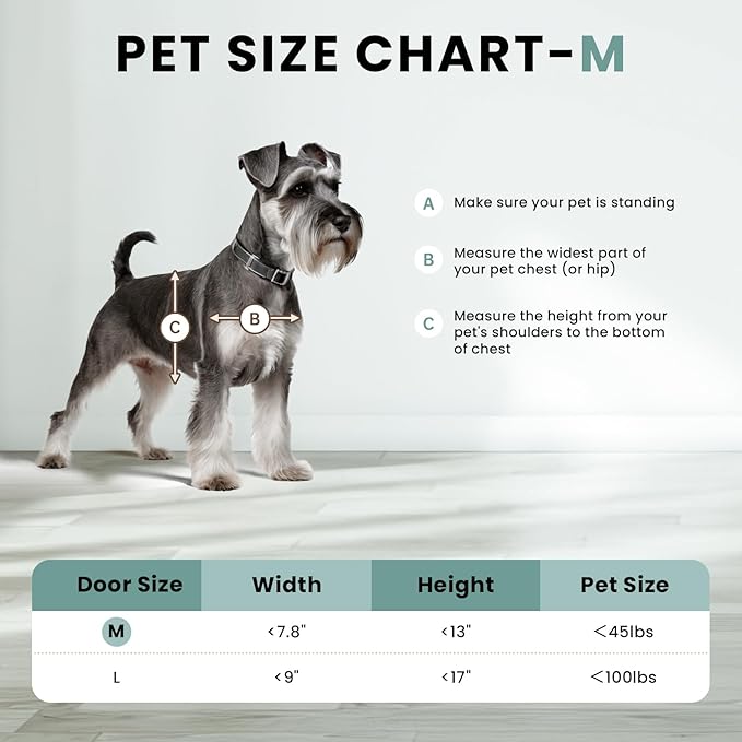 - Find the Perfect Fit for Your Dog: Please carefully review the size chart in the photo to ensure your puppy/kitty can pass through comfortably. The flap opening is 13.2" x 7.9". Suitable for pets up to 45 lbs. This plastic dog door fits doors or walls between 3.35"-7.48" thick – please confirm your measurements before purchasing