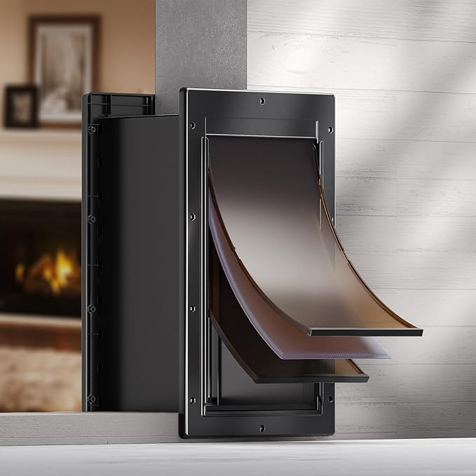 - Wall Entry Pet Door: Petcoming's new wall-mounted 3-flap pet door fits walls of varying thicknesses from 3.35"-7.48". Build a tunnel through wall from your house to another space for your doggy/kitty, it gives your dog safe independence and fun