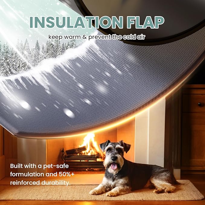 - 2+1Flap for Extreme Weather Protection: Go beyond basic type. The Petcoming dog door includes two high-quality magnetic flaps and one insulated flap.Our 3-flap dog door outperforms typical 2-flap dog door. It combats extreme summer heat while offering enhanced wind, water, and sound resistance