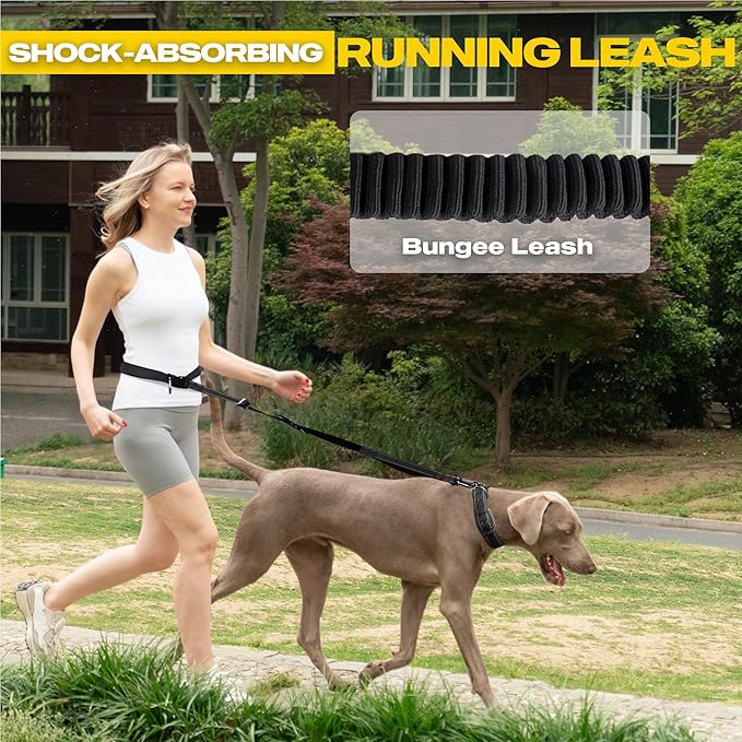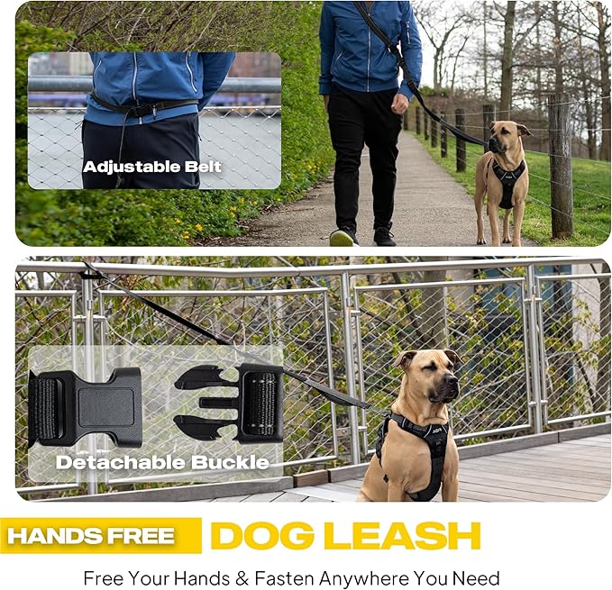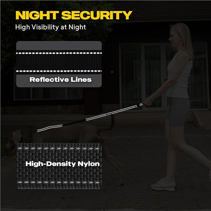 - 【Adjustable Shock-Absorbing Leash】- Extend bungee leash length (4.5ft-7ft) for versatile control. Ideal running leash for dogs with shock-absorbing bungee. Reflective strips enhance dog walking belt night safety