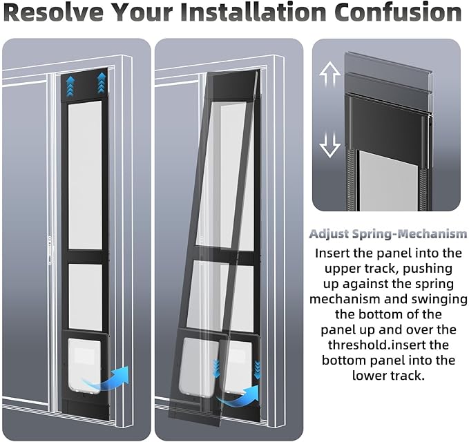 - 1.【EASY INSTALLATION】 No-Cut is required. Simply slide the doggy door into your sliding glass door track and fix it with T metal kits. Clear instructions are included; installation takes just 15 minutes.
