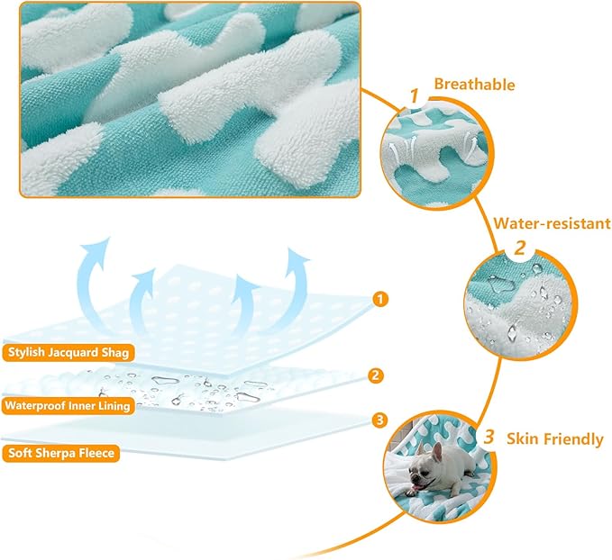 - Waterproof Dog blanket: Double-side Blankets are made of Stylish Jacquard Shag and Soft Sherpa Fleece, and blanket's inner lining ensures no spills or dribbles seep through to the other side, keeping your pet (and furniture) dry and clean.