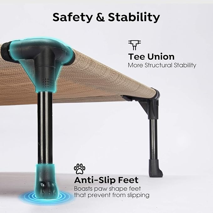 - Stability: The three-way connector structure, combined with the non-slip feet and a central supporting column, ensures robust, stable support. This design keeps the elevated dog bed securely in place, providing your pet with a safe and comfortable resting environment