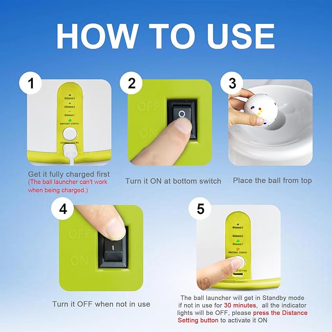 - Standby Mode: The dog ball launcher has a power-saving setting. After the device is turned ON, it will automatically enter standby mode if it is not in use for 30 minutes, all indicator lights will turn OFF and it can't launch the ball. Please just press the Distance Setting button to reactivate the ball launcher.