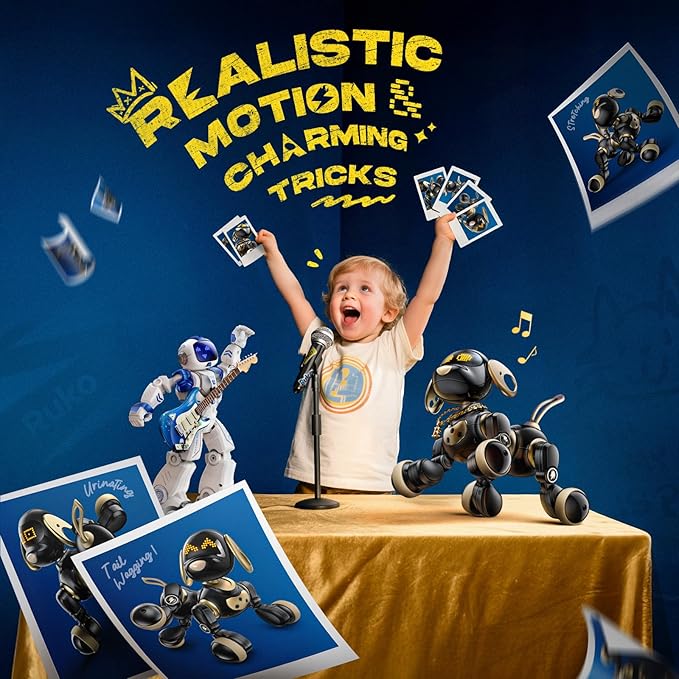 Ruko 18011 Robot Dog Toy, Smart Interactive Puppy with 30+ LED Faces, Remote & Gesture Control, Programmable Electronic Pet for Kids Ages 3–8, Black & Gold