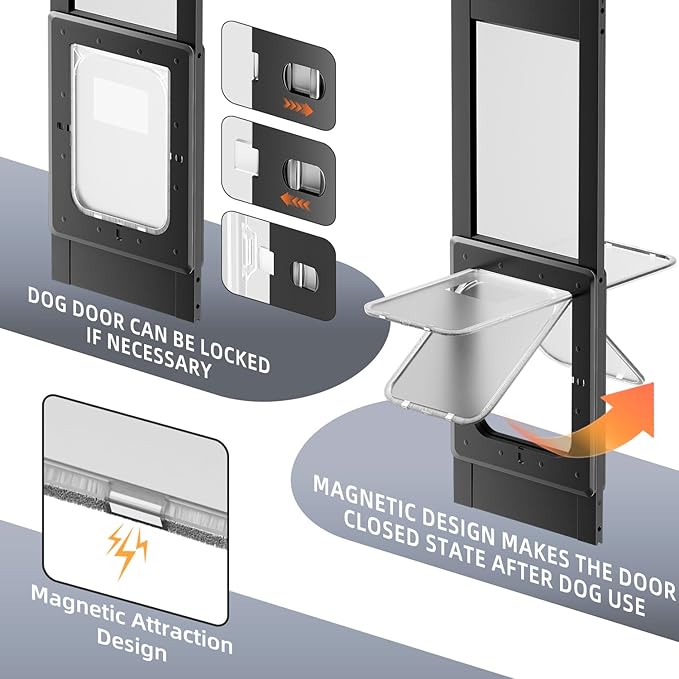 - 4.【SECURITY LOCK】The sliding door dog door insert has a latch design in the plastic flat which locks to keep your pet safe. An aluminum frame with high-strength glass ensures the doggy door lasts for long time use.