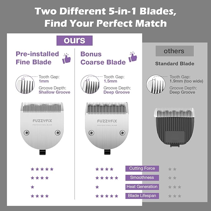 - 【Two 5-in-1 Blades Clippers Kit】 Includes two detachable 5-in-1 blades (1× pre-installed 1mm fine blade + 1× bonus 1.5mm coarse blade,adjust 0.8-1.2mm) and a complete metal accessory set: 8 guide combs (3-25mm), adapter, USB-C cable, brush, care oil, and storage case.