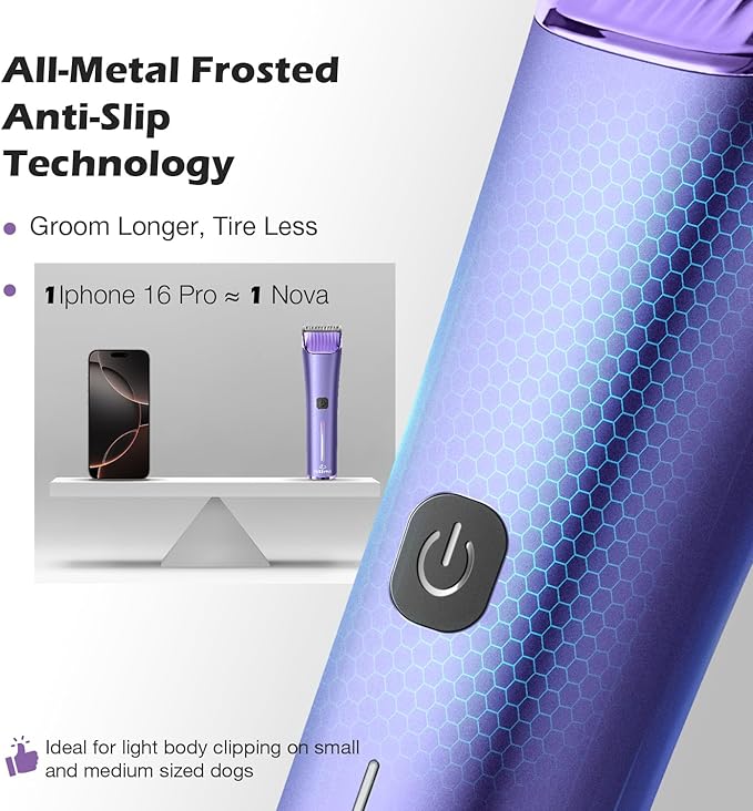 - 【Ergonomic Metal Grip Design】 The full-metal frosted body provides anti-slip grip,professional durability and balanced weight to reduce hand fatigue during long sessions. Heavy-duty guide combs work across all coat types and body zones—from light cat grooming to precisise trimming on large dogs and horses.