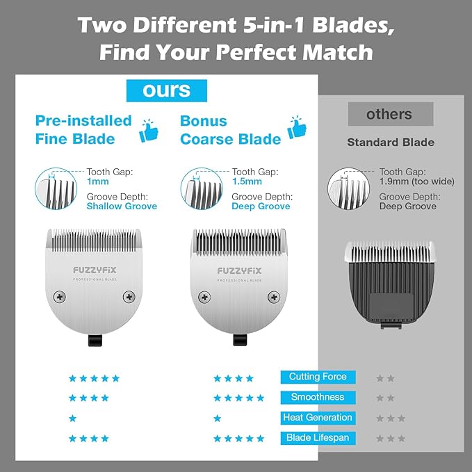 - 【Two 5-in-1 Blades Clippers Kit】 Includes two detachable 5-in-1 blades (1× pre-installed 1mm fine blade + 1× bonus 1.5mm coarse blade,adjust 0.8-1.2mm) and a complete metal accessory set: 8 guide combs (3-25mm), adapter, USB-C cable, brush, care oil, and storage case.