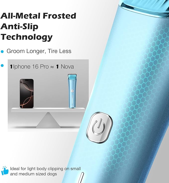 - 【Ergonomic Metal Grip Design】 The full-metal frosted body provides anti-slip grip,professional durability and balanced weight to reduce hand fatigue during long sessions. Heavy-duty guide combs work across all coat types and body zones—from light cat grooming to precisise trimming on large dogs and horses.