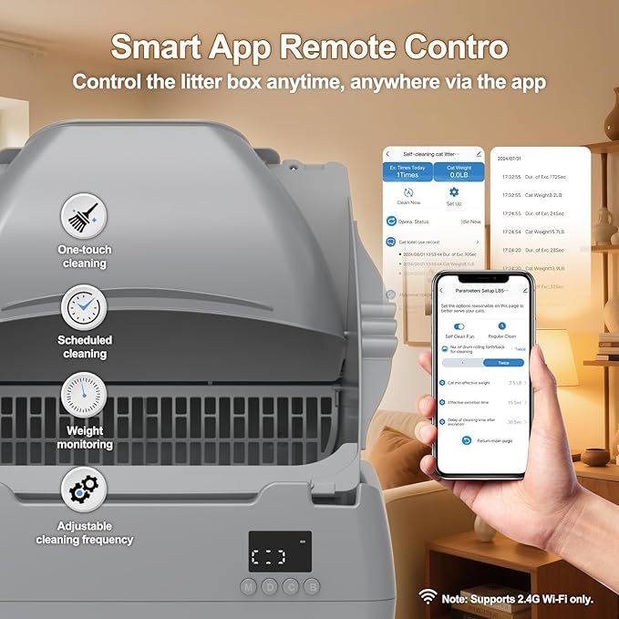 - 📲APP CONTROL: Monitor and manage your automatic cat litter box remotely through a smartphone app, providing real-time updates and control of cleaning cycles.