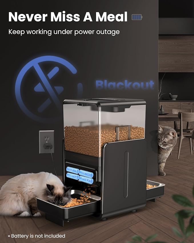 - Dual Power for Peace of Mind: Stay worry-free with dual power- adapter and 4 AA non-rechargeable batteries (not included) with automatic switch-over during outages. 45-day battery backup ensures reliability. Record a 10-second custom meal call to comfort your pets and build a stronger bond