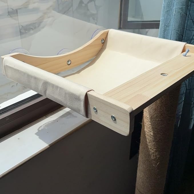 Cat Window Perch with Scratching Post Strong Supported - Large Hammock Bed for Cats Inside - Solid Wood Seat, Soft Cushion - Rustic Indoor Cat Tree Shelf for Sunbathing (Natural, Large 2)